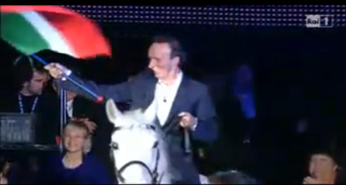 Roberto Benigni ha incollato davanti allo schermo 15 milioni 398 mila telespettatori: è la terza serata del Festival di Sanremo, quella dedicata al 150esimo anniversario dell’Unità d’Italia. È arrivato a cavallo, sventolando il tricolore, anche se “avevo qualche dubbio a entrare col cavallo: è un periodo in cui ai cavalieri non gli dice tanto bene”, ha esordito l’attore. Morandi è già preoccupato e, da un angolo del palco, ascolta Benigni. L’attore non riesce a trattenersi: “Tutto sto tempo perso con le procure per sapere se era nipote di Mubarak (parla di Ruby, ndr). Bastava andare all’anagrafe e vedere se Mubarak di cognome fa Rubacuori”.
