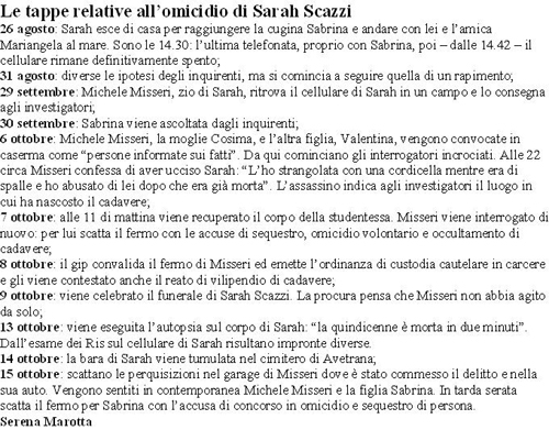 anche per me e’ stata la cugina sempre insieme al padre,sabrina nn mi ha mai convinta,il suo modo di parlare nn ne’ convincente,si vede che nasconde e ha paura che la verita’ verra’ fuori,ne’ sono certa. se e’ come dico io,spero solo che verranno condannati x un bel po’ di anni….che coraggio uccidere una ragazzina di 15 anni,che mostri….