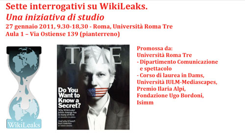Un appuntamento di studio per rispondere a sette quesiti sul caso WikiLeaks. L’incontro, dal titolo “Sette interrogativi su WikiLeaks”, promosso dall’Università Roma Tre Dipartimento Comunicazione e Spettacolo, Univertità IULM, Premio Ilaria Alpi, Fondazione Bordoni e Isimm, si terrà, giovedì 27 gennaio 2011, dalle 9.30 alle 17,30, a Roma, all’Università Roma Tre in via Ostiense 139.