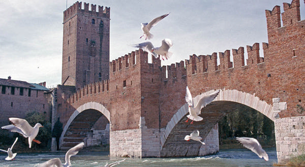 Il ponte Pietra, principale collegamento della città romana tra le due sponde dell’Adige, distrutto durante l’ultima guerra, fu ricostruito con i materiali originali ritrovati nel fiume.
