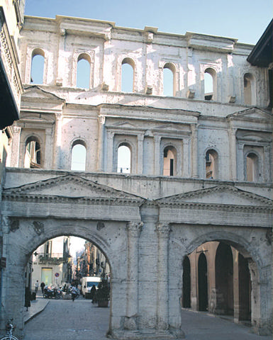 Principali accessi dell’antico sistema difensivo romano erano la porta Borsari, in pietra bianca, costituita da due archi a livello del suolo e due serie di aperture ad arcate, e la porta dei Leoni, uno dei ritrovamenti archeologici più raffinati di Verona e di cui ne rimane solo la metà.