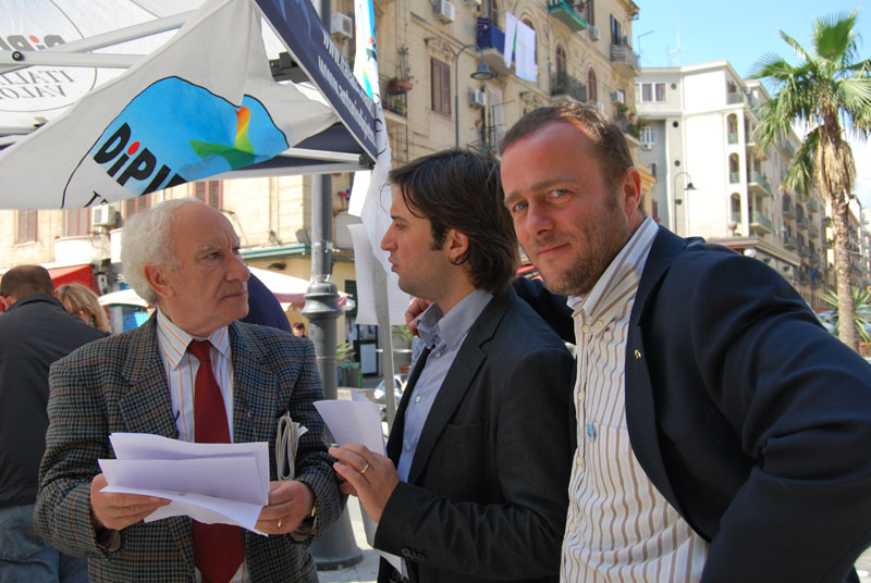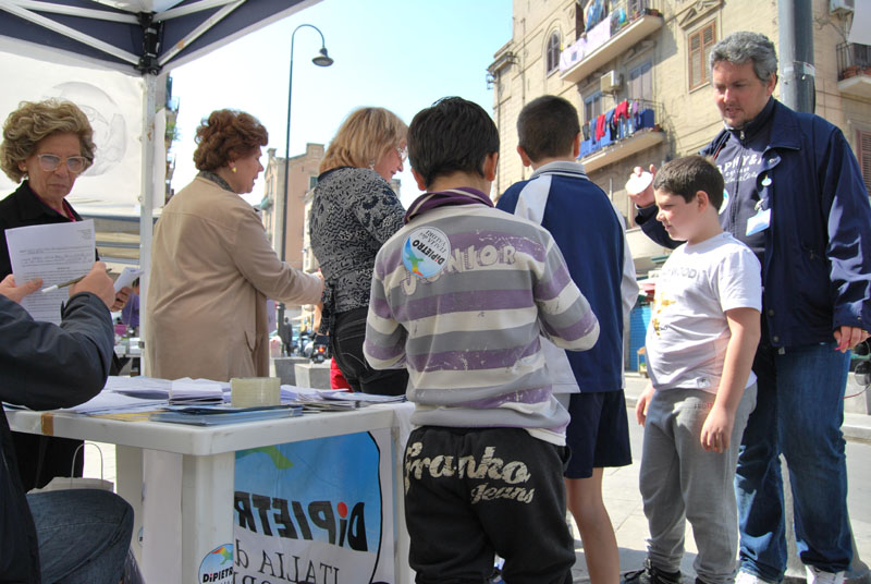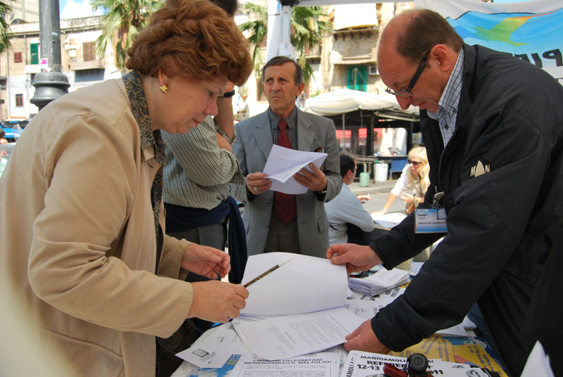 Alla cassa c’è la piccola Vittoria, 9 anni, che oggi è libera e aiuta il suo papà e il nonno al bar. Accanto ci sono Elena Pagano, 38 anni, e suo cognato, Vincenzo Canzoneri, da sei mesi titolari dell’edicola del Borgo Vecchio. Siamo in piazza largo Eduardo Alfano: qui ci sono i valori. I bimbi sotto il gazebo della legalità, organizzato dal circolo Idv Sandro Pertini, gridano “viva Di Pietro”. Nel frattempo alcuni cittadini firmano la richiesta per richiedere il rimborso Tarsu degli anni 2007, 2008, 2009. L’avvocato Giuseppe Massaro arriva da Mondello. Crocifissa Lo Grande da via dell’Orsa Minore. Gaspare Catania abita vicino piazza Giulio Cesare. Carmelo Clausi e Stefano La Malfa arrivano da corso dei Mille. Poi c’è Stella Faraci che abita dalle parti di via Libertà. Tutti hanno saputo dell’iniziativa grazie ai giornali e alle tv. Tutti lamentano la carenza di vigilanza per le strade della città. “Siamo allo sbaraglio”, dicono. Sono tanti, infatti, i furti che si verificano soprattutto nel salotto della città. “Un solo carabiniere a vigilare nella zona non basta”, aggiunge una residente.