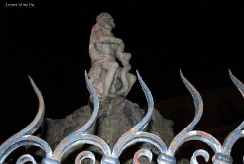 Ai piedi del re barbuto sgorga l’acqua che scivola giù, lungo la roccia, e finisce nelle vasche. L’acqua, tuttavia, non è l’unica cosa a finire nella fontana. A tratti, infatti, il gioco provocato dall’acqua è interrotto dai rifiuti. Un tempo frequentata per l’antico mercato, allora la piazza si chiamava appunto Fieravecchia, oggi, sparite le bancarelle, è cambiato il nome e non solo: ribattezzata piazza Rivoluzione in memoria dei moti del 1820 e del 1848, l’attrattiva principale della piazza sono i due locali, dove nei fine settimana si riuniscono centinaia di ragazzi, che la trasformano in un pub a cielo aperto.