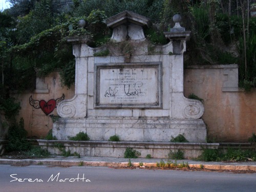 Intanto, ai segni lasciati dal tempo e dalle polveri dello smog, si aggiungono anche quelli lasciati dalla mano di qualche passante proprio sulle lapidi commemorative dedicate all’arcivescovo di Monreale, che si trovano lungo la strada, davanti alla fontana. Si tratta della seconda targa, percorrendo la strada da Palermo in direzione della cittadina normanna, dove qualcuno ha disegnato un cuoricino alato accuratamente dipinto di rosso con al centro le iniziali di un nome.