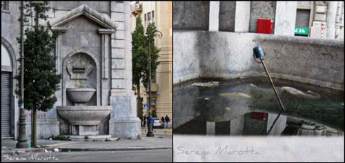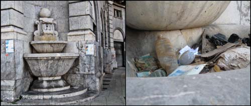 Intanto, se si prosegue la visita delle fontane della piazza, la scena non cambia, anzi peggiora. In tutto, sono quattro le fontane che fanno parte dell’Ingresso monumentale, i due edifici semicircolari realizzati in stile neobarocco, edificato all’ingresso di via Roma. Dalle due grandi fontane ad edicola, che si trovano all’inizio di via Roma, dove i rifiuti sono sommersi dall’acqua stagnante, ad eccezione di qualche manico d’ombrello che riemerge insieme con i sacchetti di plastica, si passa poi alle due più piccole, ad angolo del monumento, in prossimità della villetta.