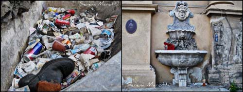 Anche qui abbonda la varietà di rifiuti. All’interno della fontana, lato via Lincoln, troviamo la vasca stracolma di bottiglie e cartoni, l’altra, in direzione di Porta Sant’Antonino, invece, è piena di sacchetti neri per la spazzatura, bidoni di plastica, giornali e pezzi di legno. Tutti rifiuti putrefatti…