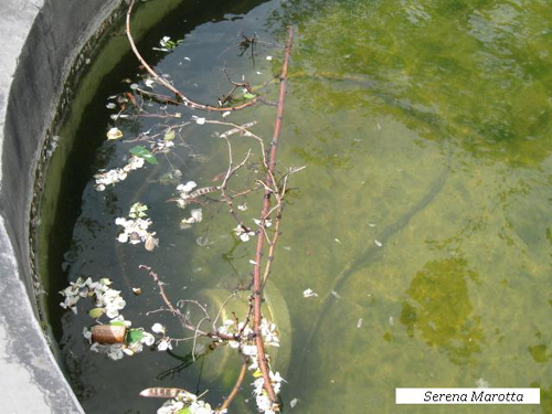 Intanto, all’interno della vasca, galleggiano anche tappi di sughero e qualche depliant. La superficie delle vasche è scrostata, soprattutto nella parte superiore del monumento. Anche qui, come per le sculture, le macchie di umidità sostituiscono il colore bianco del marmo.