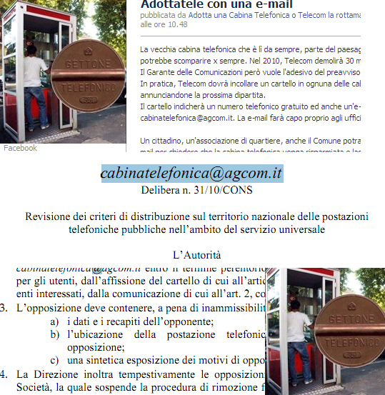 Se un comitato di quartiere, un’associazione, ma anche un semplice cittadino, è affezionato alla cabina ed è fra i pochi che le usano ancora, può inviare una mail (indirizzo in foto) all’Agcom che valuterà la richiesta. Alla stessa mail si possono segnalare atti vandalici e cabine in stato di abbandono. Non manca un’iniziativa “ad hoc” sul principale social-network del web: “Adotta una cabina” si intitola la pagina Facebook.