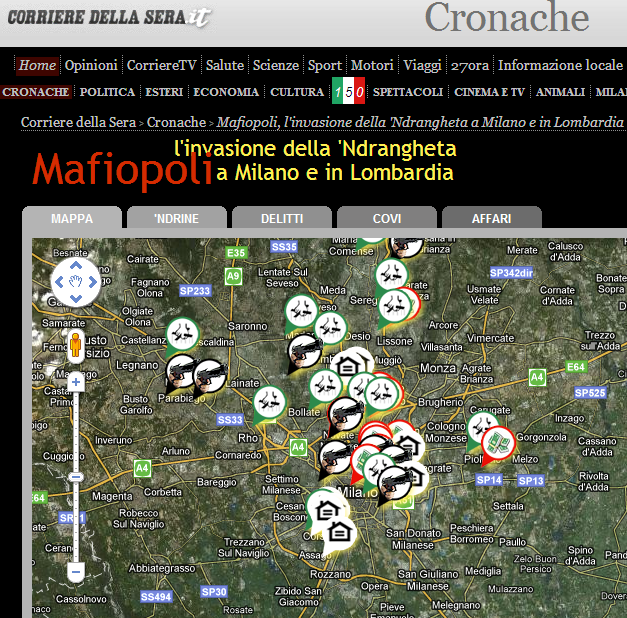 Il “Corriere”, sul proprio sito, ha anche pubblicato la mappa interattiva (foto sotto) di alcuni beni, crimini e affari scoperti in Lombardia, curata da Antonio Castaldo che ha scritto per l’editore “Chiarelettere”, e intitolata “Mafiopoli; l’invasione della ‘Ndrangheta a Milano e in Lombardia